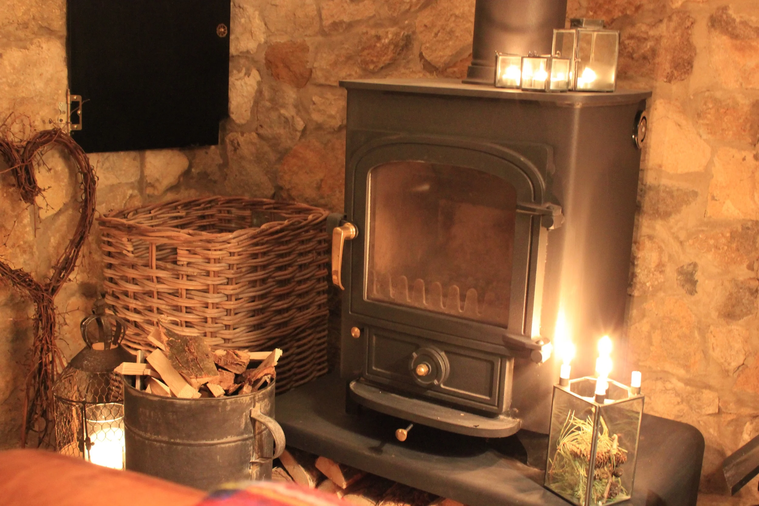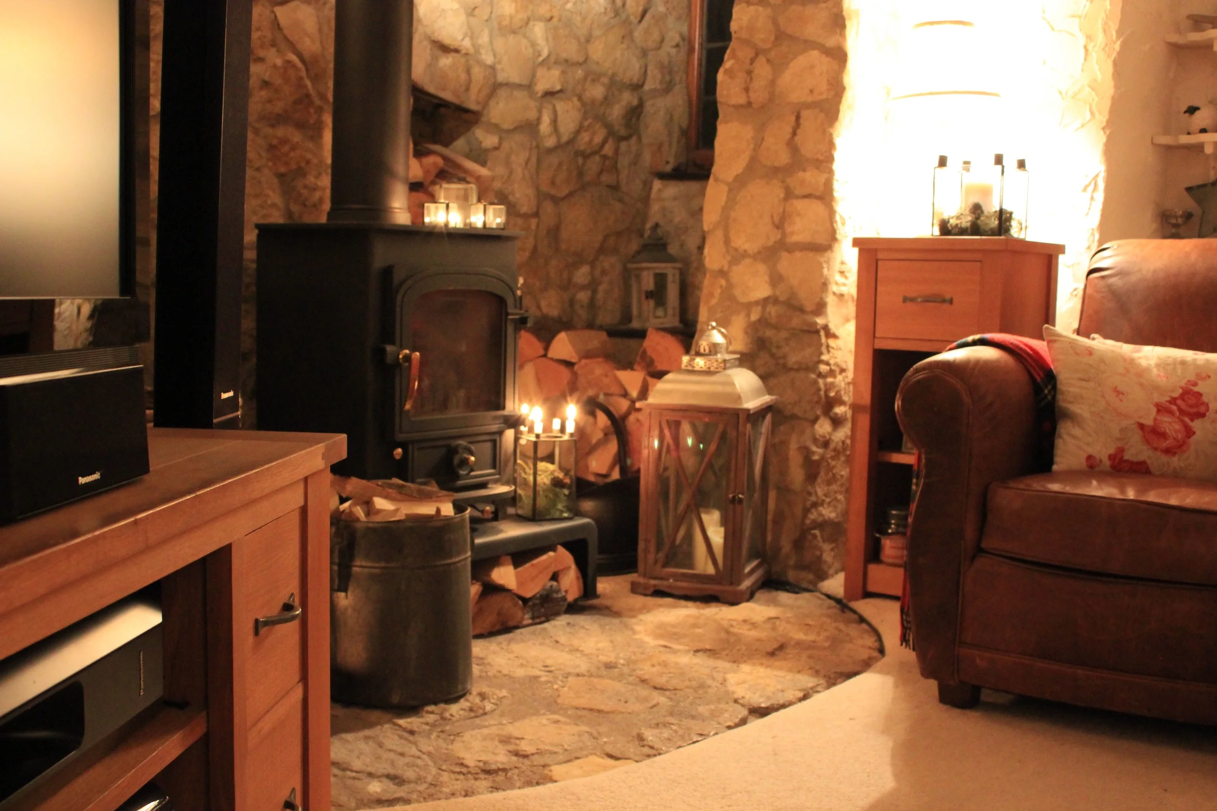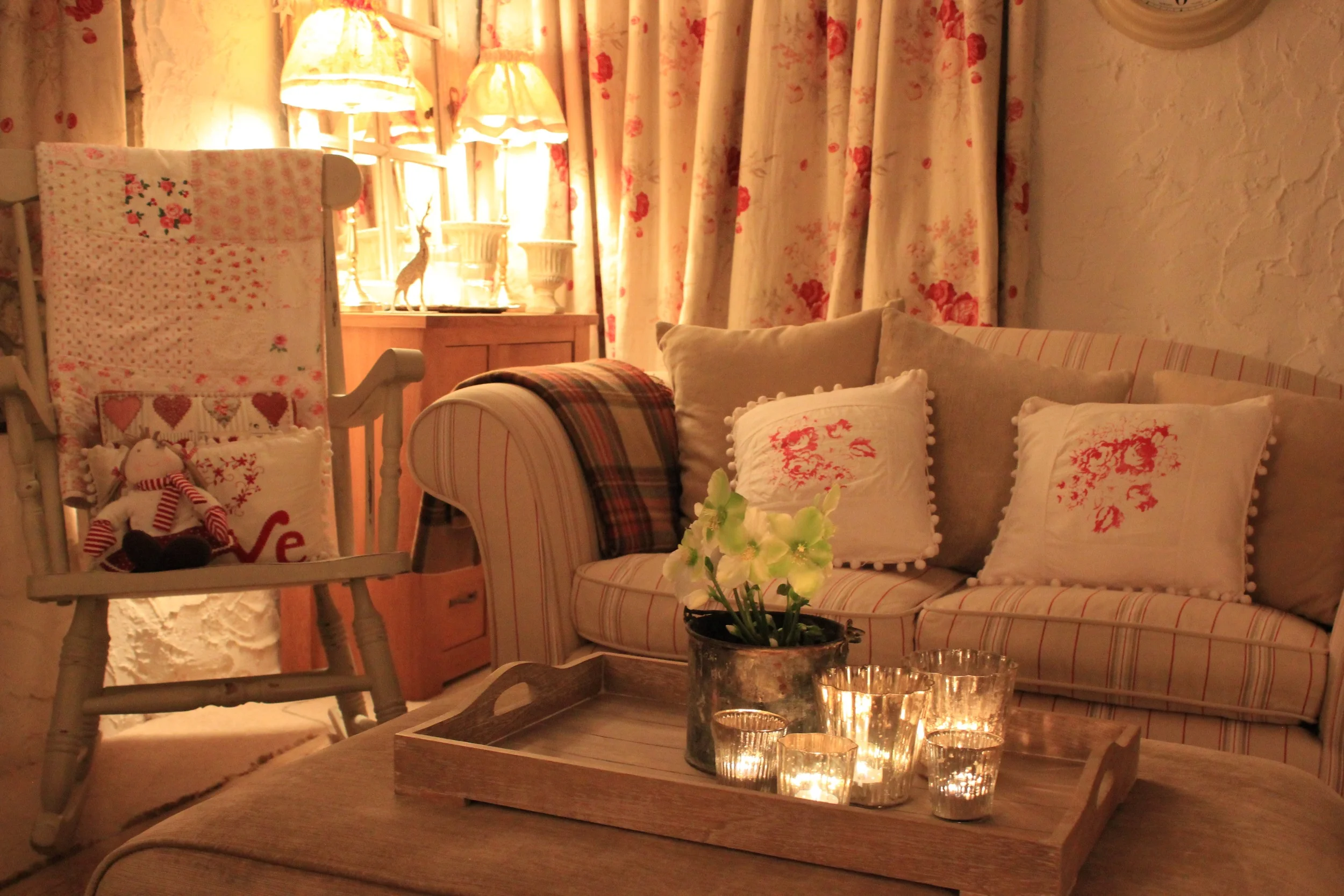The conservatory. The old wooden box houses my painting supplies. The patchwork cushion was a gift from my mum (it is a Tilda pattern using Tilda fabric). She made two cushions and a matching quilt for my 40th birthday and I love them!